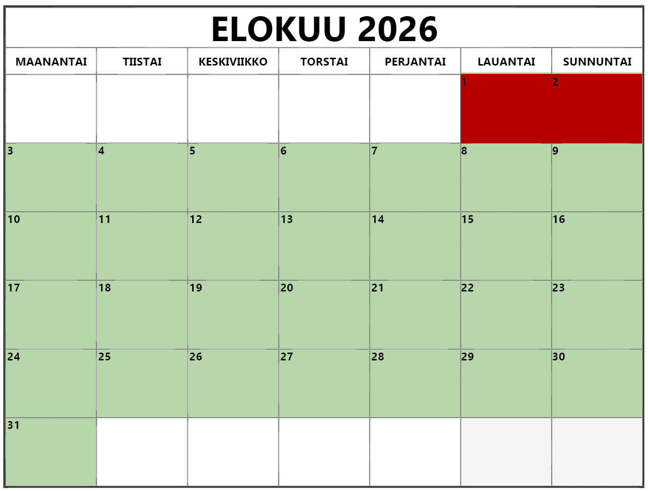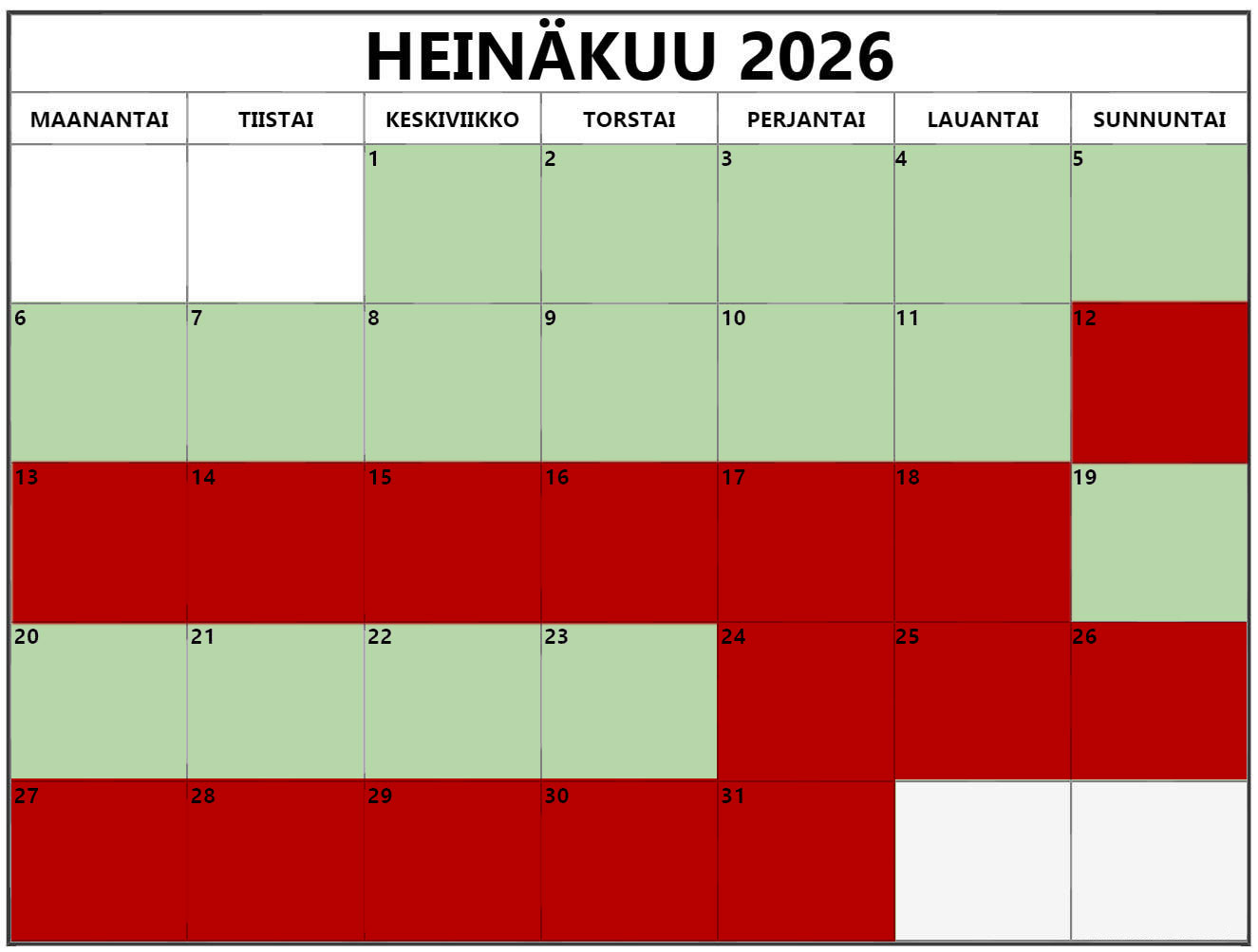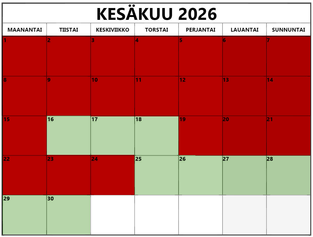 Tarkista oheisesta kalenterista, onko toivomanasi ajankohtana vapaata. Varataksesi hoitojakson ota yhteyttä meihin.